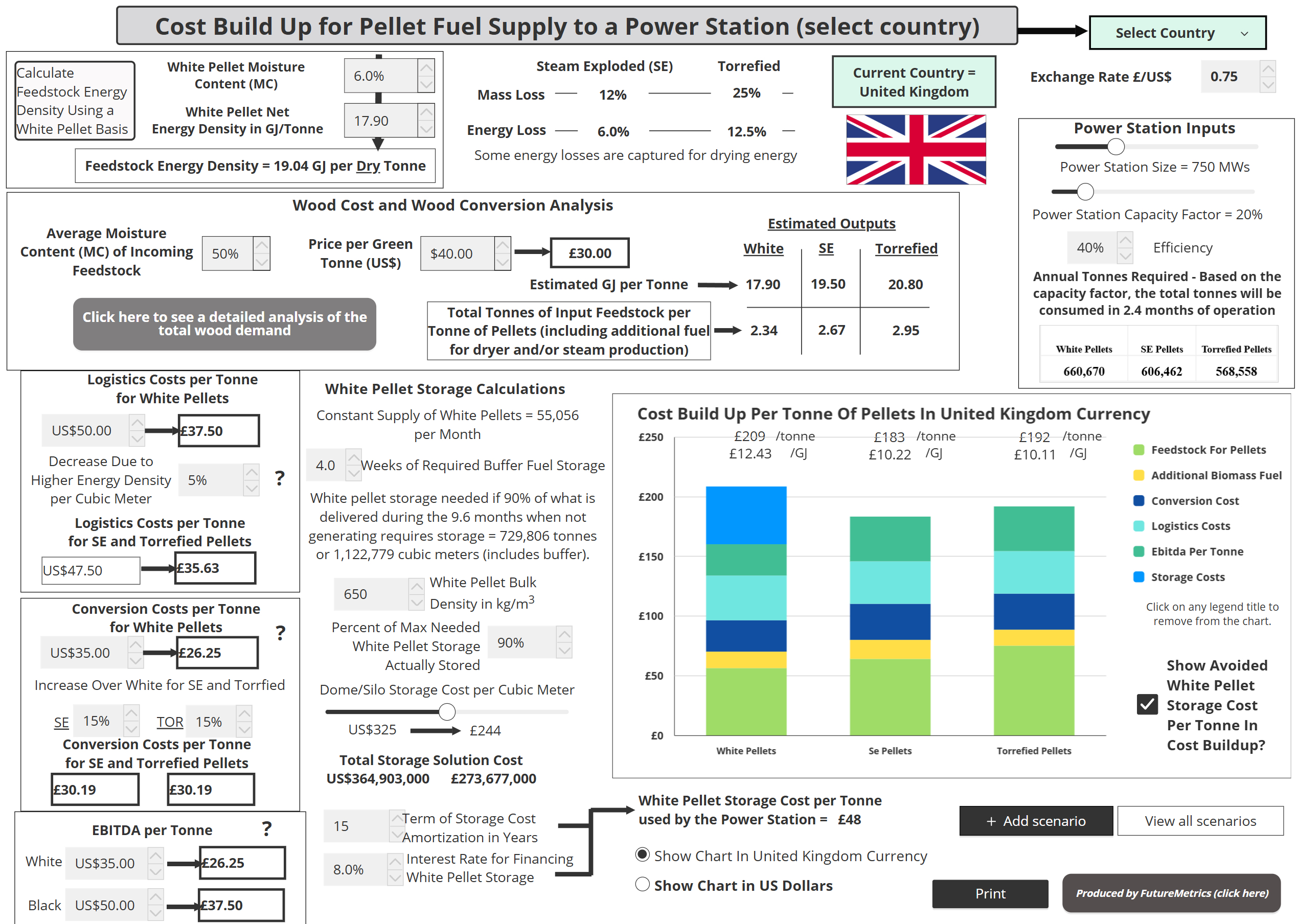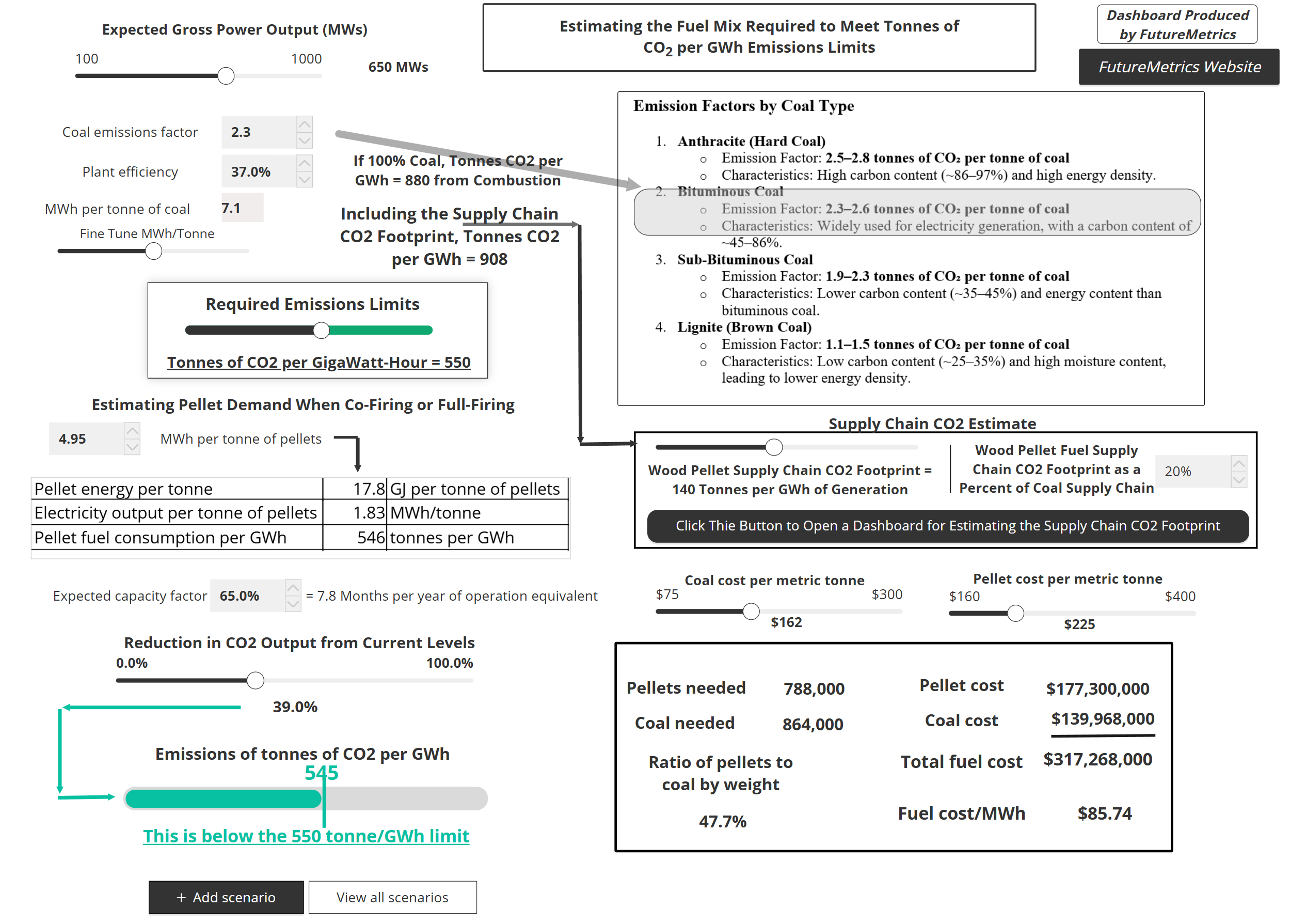 A FutureMetrics dashboard with that combines a calculation for storage and inventory requirements for a low capacity factor power station using white pellets with a calculator for determining the optimal choice between white or black pellets as fuel to replace coal.
